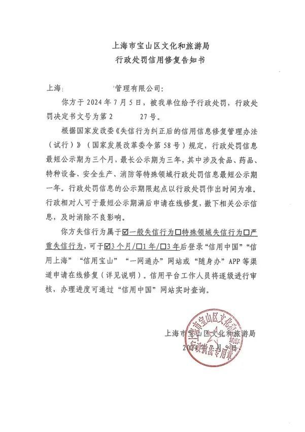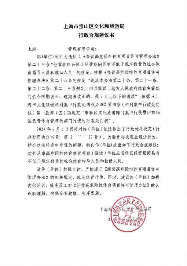 今年7月5日,寶山區(qū)文化和旅游局依照“誰處罰、誰負(fù)責(zé)”原則,“點對點”向區(qū)內(nèi)一家酒店管理公司送達首份“三書”,當(dāng)事人因違反《經(jīng)營高危險性體育項目許可管理辦法》相關(guān)規(guī)定被區(qū)文旅局執(zhí)法大隊處以罰款,除《行政處罰決定書》一并送達的還有《行政合規(guī)建議書》和《信用修復(fù)告知書》。