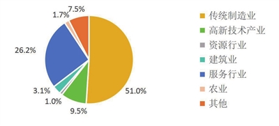 從行業(yè)看,傳統(tǒng)制造業(yè)企業(yè)占比51.0%,服務(wù)行業(yè)企業(yè)占比26.2%,高新技術(shù)產(chǎn)業(yè)企業(yè)占比9.5%,建筑業(yè)企業(yè)占比3.1%,農(nóng)業(yè)企業(yè)占比1.7%,資源行業(yè)企業(yè)占比1.0%,其他行業(yè)企業(yè)占比7.5%(如圖2)。
