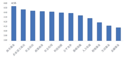 《報(bào)告》的評(píng)價(jià)指標(biāo)體系由12個(gè)一級(jí)指標(biāo)和55個(gè)二級(jí)指標(biāo)組成。12個(gè)一級(jí)指標(biāo)包括基礎(chǔ)設(shè)施、生活服務(wù)、政策政務(wù)、社會(huì)信用、公平競(jìng)爭(zhēng)、社會(huì)法治、科技創(chuàng)新、人力資源、金融服務(wù)、財(cái)稅服務(wù)、海關(guān)服務(wù)以及企業(yè)設(shè)立退出,評(píng)價(jià)指標(biāo)取值范圍為1分至5分。受訪企業(yè)對(duì)海關(guān)服務(wù)、企業(yè)設(shè)立退出、社會(huì)法治及政策政務(wù)等指標(biāo)給予了較高評(píng)價(jià),其中對(duì)海關(guān)服務(wù)指標(biāo)的評(píng)價(jià)最高,達(dá)到4.55分,位于“優(yōu)秀”區(qū)間(如圖5)。