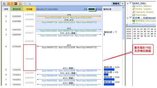 為了確定這個(gè)延遲產(chǎn)生的具體原因,分析SSL加密設(shè)備進(jìn)出數(shù)據(jù),找出相同源IP的TCP會(huì)話數(shù)據(jù)進(jìn)行對(duì)比,發(fā)現(xiàn)在SSL加密設(shè)備出口處同樣出現(xiàn)服務(wù)器端在很長(zhǎng)時(shí)間后才發(fā)出響應(yīng)數(shù)據(jù)。