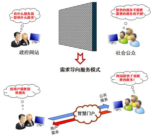 第二,智慧政府門戶的服務(wù)模式是以用戶需求為導(dǎo)向。政府網(wǎng)站是服務(wù)社會公眾的重要平臺,用戶需求是網(wǎng)站服務(wù)供給的基本指向,智慧政府門戶彌補了傳統(tǒng)“供給導(dǎo)向”服務(wù)模式的弊端,開啟“需求導(dǎo)向”的服務(wù)新模式,如圖1所示;