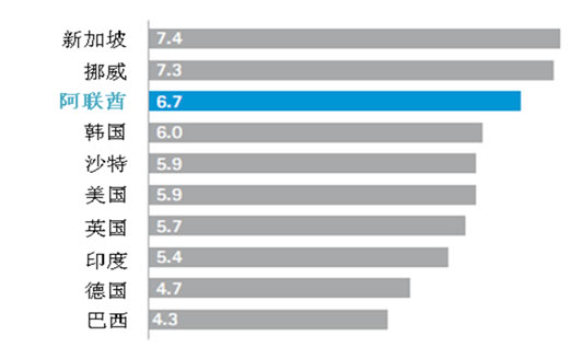 阿聯(lián)酋是全球數(shù)字政府發(fā)展中冉冉升起的領(lǐng)導(dǎo)者,數(shù)字化程度可與世界領(lǐng)先國(guó)家相媲美。《2012年聯(lián)合國(guó)數(shù)字政府調(diào)查》(United Nations E-Government Survey 2012)中,阿聯(lián)酋的在線交付服務(wù)排名第七,數(shù)字參與排名第六。