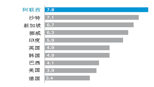 阿聯(lián)酋在公眾滿意度調(diào)查中排名第一(見圖3)。阿聯(lián)酋人認(rèn)為政府有能力滿足未來的需求。阿聯(lián)酋人知道數(shù)字渠道能夠提高服務(wù)質(zhì)量,增加社會(huì)效應(yīng),同時(shí)對(duì)公務(wù)員的技術(shù)和能力很有信心,相信他們能夠解決公共服務(wù)在未來遇到的挑戰(zhàn)。