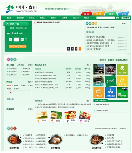 旅游信息服務(wù)平臺:采用綠色與目前生態(tài)貴陽的口號一致,也體現(xiàn)了政府在這方面的重視,整個網(wǎng)站看起來很清爽。排版采用與民息息相關(guān)的幾大類(吃、住、行、游、購、娛)進(jìn)行分類排版,并采用很多特效來提高視覺感,減少視覺疲勞。