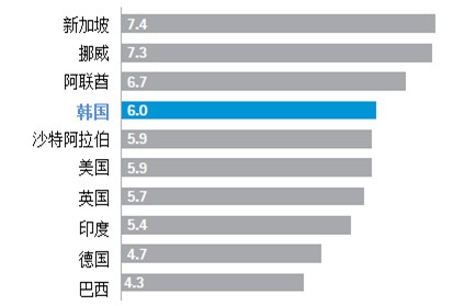 韓國民眾感到政府應改進工作質(zhì)量。在WEF的全球競爭力排名2012-2013中,韓國在政府決策透明度排名中位列133(共144個國家參加排名),在本次調(diào)查的十國中排名最后。