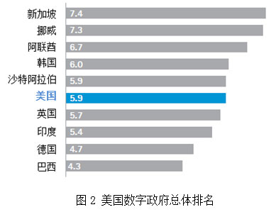 美國的數(shù)字政府業(yè)績在十個(gè)國家中名列第六,得分是5.9分(圖2)。