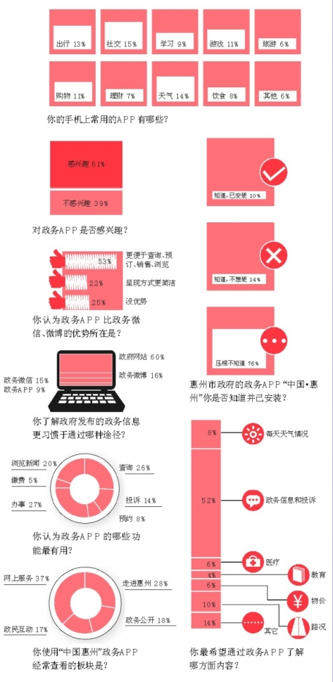 近期惠州市政府上線的“中國·惠州”A PP共設(shè)置了四大板塊———“走進惠州”、“政務(wù)公開”、“政民互動”、“網(wǎng)上服務(wù)”,涵蓋了政府信息發(fā)布、新聞瀏覽、查詢等功能。雖然功能基本能夠滿足民眾的需求,不過在本次調(diào)查中只有一成的受訪者表示自己已經(jīng)安裝了該APP,另有近八成的受訪者對于這個APP壓根不知道。