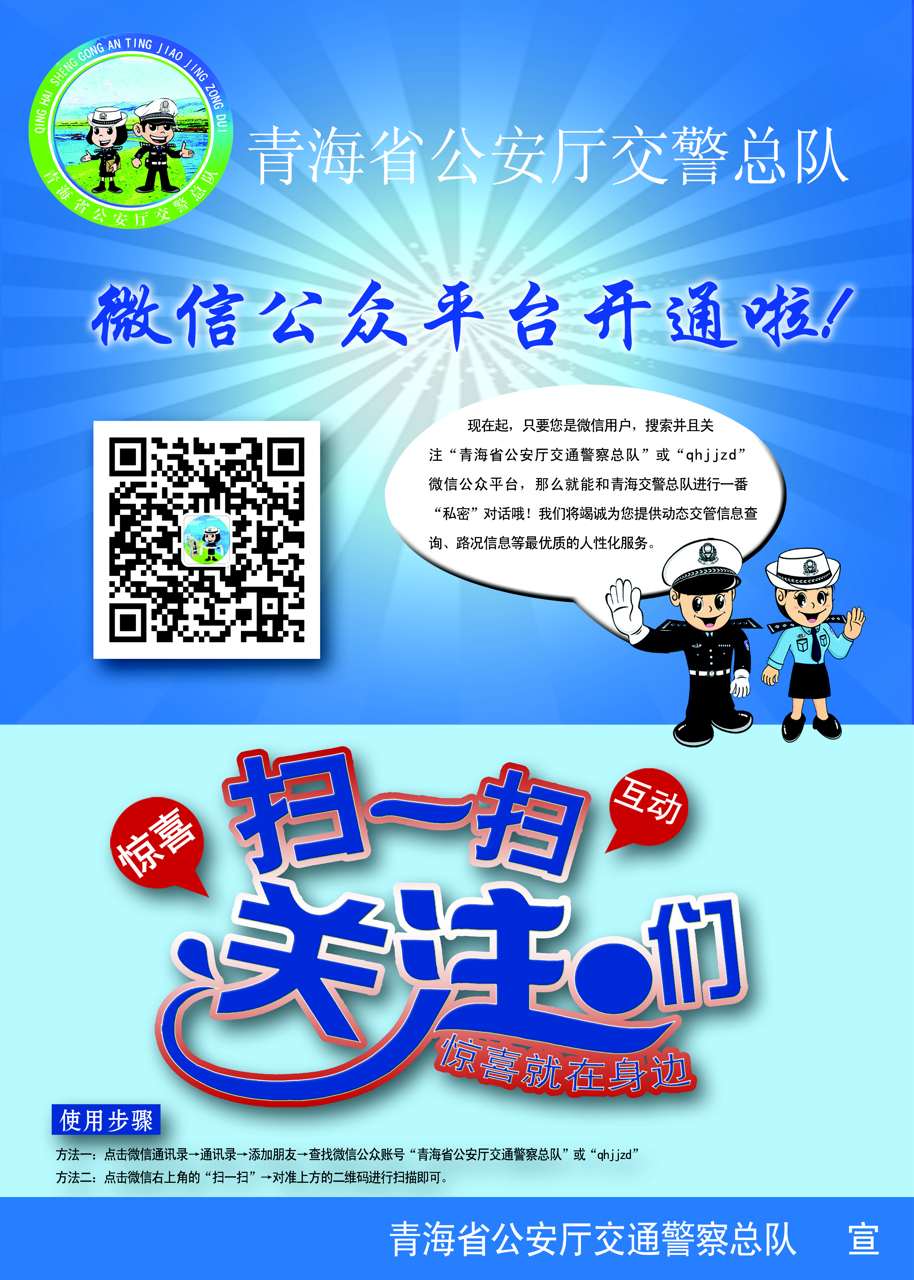 點(diǎn)擊微信-添加朋友-查找微信公眾賬號(hào)-“青海省公安廳交通警察總隊(duì)”或“qhjjzd”