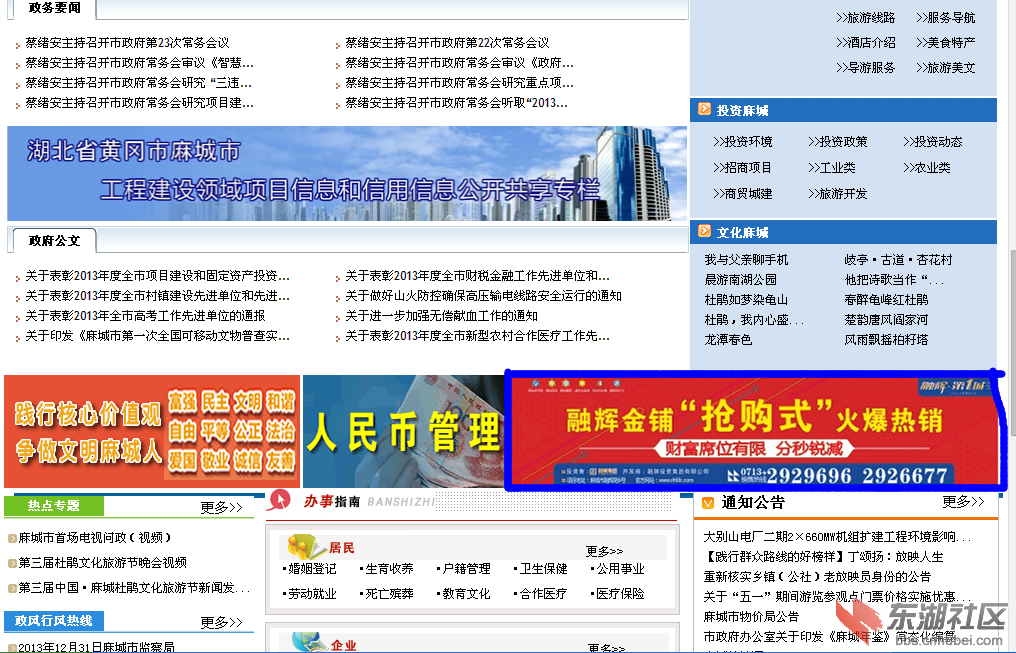 5月25日,網(wǎng)民“黃州總督”在東湖社區(qū)麻城論壇發(fā)帖,反映麻城市政府網(wǎng)首頁出現(xiàn)多幅商業(yè)廣告,其中,涉及某地產(chǎn)企業(yè)冠名的歌手大獎賽,甚至還有某商鋪“熱銷”廣告。