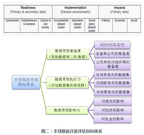 為了更好地對全球數(shù)據(jù)開放情況進行評估,《報告》主要從準備度、執(zhí)行力和影響力三個維度對各國所處開放數(shù)據(jù)的階段及其在給經(jīng)濟、政治和社會所帶來的影響進行了評估。其中,準備度是指一個國家是否具備實現(xiàn)開放數(shù)據(jù)潛力的政策、社會和經(jīng)濟基礎,包括政府、企業(yè)、公眾與民間團體三方面;執(zhí)行力是指政府發(fā)布一系列關鍵數(shù)據(jù)集以支持社會各界進行創(chuàng)新、對政府的審計問責和改進有關決策的程度;影響力是指開放數(shù)據(jù)已導致積極的政策、社會、環(huán)境和經(jīng)濟變化的程度。
