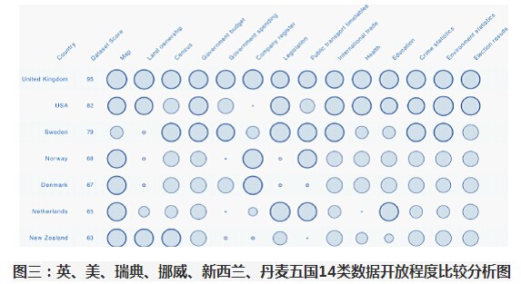這里重點選取排名前五的國家和中國進行了比較分析,分析結果顯示:英國政府14類數(shù)據(jù)開放綜合程度最高;美國的公司注冊數(shù)據(jù)公開度極低;瑞典在土地持有數(shù)據(jù)上公開力不足;挪威在土地持有、政府財政支出和法律方面數(shù)據(jù)公開力不足;丹麥在土地持有、法律和公共交通方面數(shù)據(jù)公開力不足;新西蘭則在政府財政支出、法律、健康方面數(shù)據(jù)公開力不足;與上述國家相比,中國的14類數(shù)據(jù)公開力都極低。