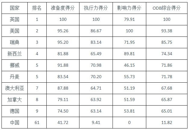 從《報告》排名和得分情況來看,中國位列第61位,綜合得分為11.82,整體排名較為靠后。從指標具體情況來看,在三個維度中,中國的準備度得分最高,但也僅為41.72,與美國、英國等先進國家相比差距較大,表明我國政府公共數(shù)據(jù)開放在政策推動、公民意識等準備方面上較為不足;執(zhí)行力得分僅為9.41,表明我國數(shù)據(jù)開放在推動創(chuàng)新、提升政府透明度和改善社會決策等方面能力明顯不足,數(shù)據(jù)有效性和價值度、易用性不高,例如我國政府支出數(shù)據(jù)只有十分粗略的總數(shù),幾乎不具備可用價值,而選舉數(shù)據(jù)則完全缺失;影響力得分為0,表明我國政府數(shù)據(jù)的應用潛力未得到有效挖掘,未來有較大的開發(fā)空間。