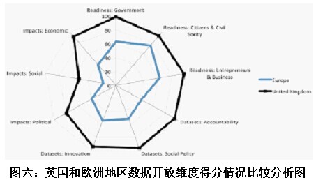《報告》從政府、企業(yè)和社會數(shù)據(jù)開放準度,數(shù)據(jù)開放對經(jīng)濟、社會和政治影響作用,以及數(shù)據(jù)在企業(yè)創(chuàng)新、政府責任意識提升和改善社會政策制定中執(zhí)行力共9個方面,對不同國家得分情況進行了詳細分析。如圖所示,藍色曲線表示歐洲地區(qū)政府數(shù)據(jù)開放水平,黑色曲線表示英國政府數(shù)據(jù)開放水平,從圖中可以看出,英國的數(shù)據(jù)開放程度略高于歐洲平均水平。