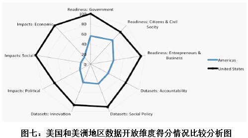 如圖所示,藍色曲線表示美洲地區(qū)數(shù)據(jù)開放水平,黑色曲線表示美國政府數(shù)據(jù)開放水平,從圖中可以看出,美國數(shù)據(jù)開放程度遠遠超出美洲地區(qū)平均水平。2009年美國政府作為“第一個吃螃蟹”的國家發(fā)布了政府數(shù)據(jù)開放倡議,要求政府部門發(fā)布機器可讀的、標準化的、高價值的數(shù)據(jù),強調數(shù)據(jù)可能帶來的經(jīng)濟價值。2013年5月美國政府再次發(fā)力,發(fā)布了要求更高的“Open Data Policy”行政命令,要求公開教育、健康、財政、農業(yè)等七大關鍵領域數(shù)據(jù),并對各政府機構數(shù)據(jù)開放時間做出了明確要求,同時推出“Project Open Data”項目,向社會開放更多政府API,讓開發(fā)者可以各方便地利用政府數(shù)據(jù)創(chuàng)造潛在經(jīng)濟價值。