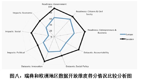 如圖所示,藍色曲線表示歐洲政府數(shù)據(jù)開放水平,黑色曲線表示瑞典政府數(shù)據(jù)開放水平,從圖中可以看出,瑞典在數(shù)據(jù)開放的得分高于歐洲平均水平。得益于瑞典政府對數(shù)據(jù)開放的重視,瑞典在政府數(shù)據(jù)開放準備方面得分較高。瑞典早在1776年就成為世界第一個形成信息權利法《Right to Information law》的國家,這為瑞典2012年發(fā)布政府數(shù)據(jù)開放統(tǒng)一門戶網(wǎng)站http://?ppnadata.se/奠定良好的基礎。