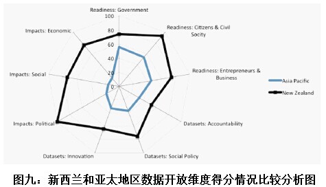 如圖所示,藍色曲線表示亞太地區(qū)政府數(shù)據(jù)開放水平,黑色曲線表示新西蘭政府數(shù)據(jù)開放水平,從圖中可以看出,新西蘭在數(shù)據(jù)開放的得分明顯高于亞太地區(qū)平均水平。早在2008年起,新西蘭政府加快了政府數(shù)據(jù)開放的腳步,成立了專門的推動機構,制定并出臺了一系列文件和措施,建立了專門的數(shù)據(jù)開放統(tǒng)一門戶網(wǎng)站,希望通過公共數(shù)據(jù)的開放,增強政府透明度,推動企業(yè)創(chuàng)新更多利潤,激發(fā)社會公眾的創(chuàng)造力。