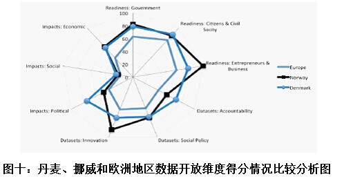如圖所示,藍色直線表示歐洲地區(qū)數(shù)據(jù)開放平均水平,黑色結點連線表示挪威數(shù)據(jù)開放水平,藍色結點連線表示丹麥數(shù)據(jù)開放水平。從圖中可以看到,丹麥和挪威數(shù)據(jù)開放水平略高于歐洲平均水平。丹麥和挪威同屬北歐國家,在數(shù)據(jù)開放總體得分上差距不大,但在具體指標得分上存在一定的差異。在準備度方面,兩國在政府、公眾和社會團體準備度差別不大,差別最大的是企業(yè)和公司數(shù)據(jù)開放準備度。挪威早在2010年就推出了數(shù)據(jù)開放平臺,2011年發(fā)布了數(shù)據(jù)編目,在一個“公共管理和電子政務”機構的指導下,挪威的數(shù)據(jù)開放平臺利用統(tǒng)一的API端口將政府數(shù)據(jù)以機器可讀的格式進行集中存儲形成“Data Hotel”,“Data Hotel”通過data.norge.no門戶網(wǎng)站將政府機構發(fā)布的數(shù)據(jù)向用戶開放;在本次調查中,77個國家中僅有3個國家較為完整地公開了企業(yè)注冊數(shù)據(jù),挪威就是其中之一。2010年丹麥在國家數(shù)字化委員會的推動了發(fā)布了開放數(shù)據(jù)編目,隨后丹麥政府開始加速對數(shù)據(jù)資產(chǎn)的管理,并在2012年開始實施以政府內容數(shù)據(jù)再利用為核心的“丹麥基礎數(shù)據(jù)項目”,致在鼓勵政府機構合并、減少冗余和提升效率。
