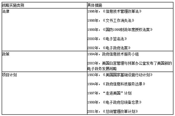 整體而言,美國(guó)電子政府發(fā)展過(guò)程中使用過(guò)的基本策略,依據(jù)戰(zhàn)略實(shí)施類(lèi)別分類(lèi),具體如下: