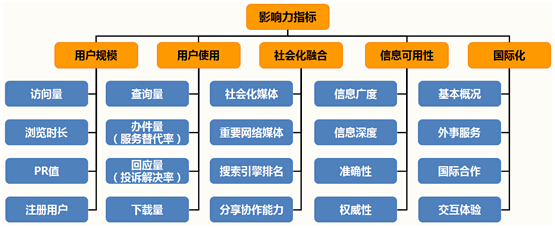 影響力是衡量政府網(wǎng)站對(duì)政府形象塑造、政府工作績效支撐度的重要指標(biāo),圍繞用戶的視角、生態(tài)的視角、權(quán)威的視角、國際的視角,其考評(píng)維度可以從“用戶規(guī)模、用戶使用、社會(huì)化融合、信息可用性、國際化”5個(gè)方面來展開。