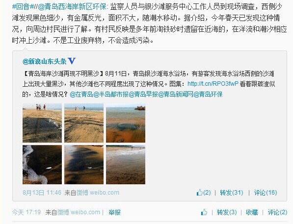 澎湃新聞曾經(jīng)報(bào)道,青島環(huán)保局開出654元排污罰單引發(fā)爭議。對此,青島環(huán)保局就信息公開、處罰目的、法律規(guī)定及時(shí)與網(wǎng)民互動(dòng),因此入榜“十大最快速應(yīng)對政務(wù)微博”。