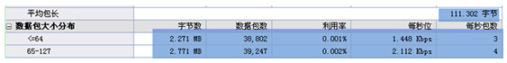 上圖也反映了一些特征,我們看到,抓包網(wǎng)絡(luò)內(nèi)的數(shù)據(jù)包長(zhǎng)只有111.3Byte,這個(gè)平均包長(zhǎng)是偏小的,而且數(shù)據(jù)包大小分析發(fā)現(xiàn)<=64字節(jié)和65-127字節(jié)之間的數(shù)據(jù)占了絕大多少,這就充分說明了網(wǎng)絡(luò)中有大量的小包存在。