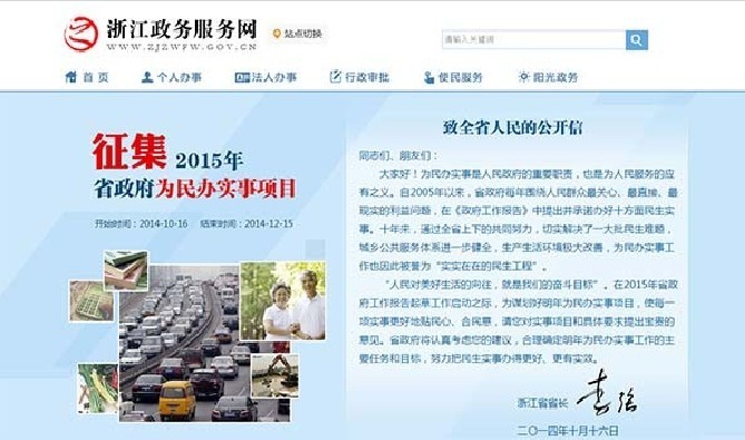 與前一封信略有不同的是,李強(qiáng)的公開信借助的是“浙江政務(wù)服務(wù)網(wǎng)”這一平臺。此舉既體現(xiàn)浙江決策層一貫以來希望利用互聯(lián)網(wǎng)更廣泛收集民意的期望,折射出通過網(wǎng)絡(luò)問政于民、問需于民、問計(jì)于民的誠心,以更加開放的方式和開明的態(tài)度對待網(wǎng)民意見,為履職盡責(zé)凝聚最廣泛的力量,同時也進(jìn)一步推廣了“政務(wù)服務(wù)網(wǎng)”這一浙江首創(chuàng)的深化改革“具象”。
