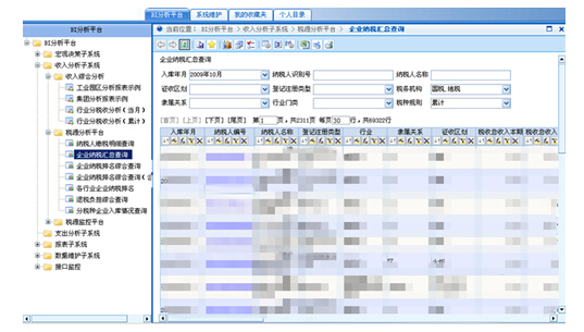 通過財稅庫銀橫向聯(lián)網(wǎng)系統(tǒng)(TIPS2.0)的數(shù)據(jù)和稅務(wù)登記信息的結(jié)合,以及用戶定義企業(yè)屬性(工業(yè)園區(qū)、企業(yè)集團(tuán)等),滿足對財稅收入以及重點稅源的分析需求,提供對稅收的多角度分析,為各層管理人員提供統(tǒng)計和分析數(shù)據(jù),協(xié)助其及時發(fā)現(xiàn)問題并快速響應(yīng)。