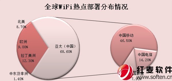 作為移動互聯網的一支生力軍,加強WiFi網絡的覆蓋可謂備受關注。ABI Research顯示,在全球WiFi熱點部署中,68.6%的WiFi熱點在亞太地區(qū)部署,拉丁美洲占了12.3%,歐洲占了9%,北美占了8.7%,中東及非洲地區(qū)則僅有1.4%。在亞太地區(qū),僅中國就已部署了62萬個WiFi熱點。其中,中國移動已建設了42萬個WiFi熱點,占比46.50%;中國電信部署了12.8萬個熱點,占比14.20%;中國聯通部署了7.2萬個,占比7.90%。