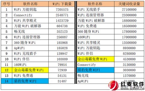 從WiFi軟件下載量來看,最多是WiFi萬能鑰匙,下載量達到7205575,由于上網速度越快,使用該軟件的人數越多;其次是一款很實用的WiFi共享軟件Connectify;再次是WiFi共享精靈。這些都具有無線電波的覆蓋范圍廣、傳輸速度非???、廠商進入該領域的門檻比較低等優(yōu)勢,同時還能滿足個人和社會信息化的需求,并且還可以不受布線條件的限制。