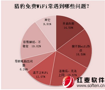 雖然獵豹免費WiFi發(fā)布2.0正式版,支持90%以上校園網,首創(chuàng)個性歡迎頁,并完美包養(yǎng)市面上所有的隨身WiFi,將獵豹免費WiFi獨創(chuàng)的防蹭網、設備限速、定時關機、中文名等WiFi拓展功能發(fā)揮到極致,但19.57%用戶反映稱,連接后無法上網;還有18.59%的用戶反映搜不到WiFi熱點。