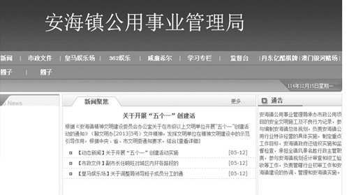記者點(diǎn)開鏈接,乍一看,像是個(gè)正規(guī)網(wǎng)站,仔細(xì)一瞧,發(fā)現(xiàn)這個(gè)頁(yè)面無(wú)論是網(wǎng)站結(jié)構(gòu)還是美工程度都比較粗糙。頁(yè)面正上方有著大大的“安海鎮(zhèn)公用事業(yè)管理局”幾個(gè)字,下面一欄導(dǎo)航中有十個(gè)小欄目,其中包括“動(dòng)態(tài)新聞”、“市政文件”等,令人咋舌的是,竟然還有“皇馬娛樂場(chǎng)”、“丹東億酷棋牌”、“澳門銀河賭場(chǎng)”等欄目。記者試著打開“皇馬娛樂場(chǎng)”欄目,跳出的是一個(gè)充滿各種賭場(chǎng)廣告和賭博信息的網(wǎng)站。