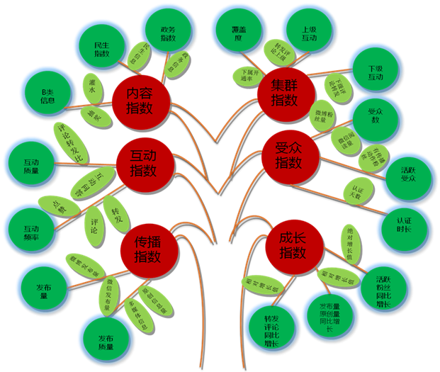 注:成長(zhǎng)指數(shù)一項(xiàng)中的數(shù)值均為某賬號(hào)考量值和行業(yè)平均值的比值圖1:中國(guó)政務(wù)新媒體排行榜評(píng)估體系樹(shù)狀圖