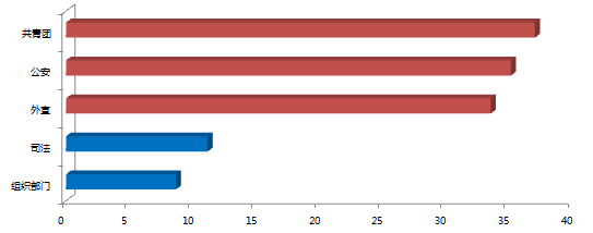 2014年,共青團(tuán)、公安、外宣、司法、組織部門(mén)的政務(wù)微博在全國(guó)政務(wù)微博中覆蓋度最廣,表現(xiàn)最為活躍,其中共青團(tuán)、公安類(lèi)、政府外宣類(lèi)政務(wù)微博賬號(hào)數(shù)量占比較高,構(gòu)成了政務(wù)微博中的第一梯隊(duì)。