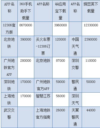 從三大平臺(tái)排行前十的APP來(lái)看,穩(wěn)居各大平臺(tái)政務(wù)APP下載量榜首。熱門(mén)政務(wù)APP大致可分如下幾類(lèi):一是交通類(lèi),包括火車(chē)、飛機(jī)、地鐵等;二是公安類(lèi),尤為突出的是各地的交警;三是天氣類(lèi),由氣象局推出的應(yīng)用成為不少人的必備軟件。
