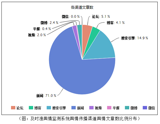 通過(guò)上圖的各傳播渠道的文章總數(shù)對(duì)比可以看出,新聞是當(dāng)前傳播渠道中比例最大的一個(gè)平臺(tái),占總文章數(shù)的71.0%;其次是搜索引擎,所占比例為總體的14.9%;而論壇、博客、微博、視頻、平媒等傳播平臺(tái)的發(fā)布量相對(duì)較少。