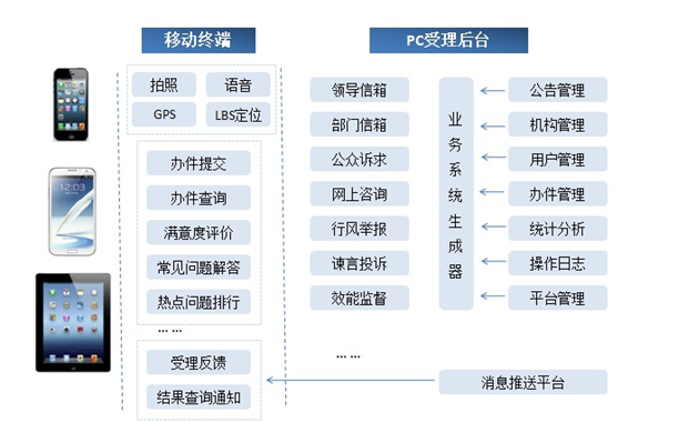 平臺支持信息推送技術(shù),"辦件"的辦理狀態(tài)和結(jié)果可以通過云端的消息中心推送至移動終端告知用戶,便于用戶能夠及時準(zhǔn)確地了解其遞交辦件的辦理進(jìn)程,并對其結(jié)果及時查看,并免去了短信資費(fèi)。