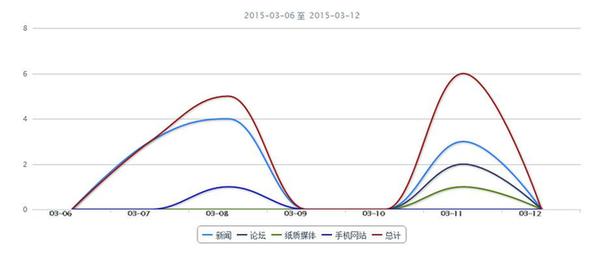 從上圖可看出,事件發(fā)展趨勢較為起伏,整個事件的爆發(fā)是在03-07。新聞類型的數(shù)據(jù)較為突出,在03-11的變化最明顯,媒體和網(wǎng)民對此事給予了高度的關注,一度將事態(tài)發(fā)展推向高點。