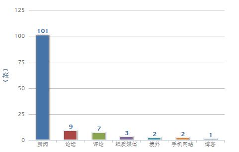 截止3月12日,新華網(wǎng)網(wǎng)絡輿情服務平臺從新聞、論壇、博客、評論、紙質媒體、視頻、手機網(wǎng)站等各個類型的數(shù)據(jù)進行監(jiān)測,結果顯示數(shù)據(jù)總量約為125篇,其中新聞類型的數(shù)據(jù)最多,約為101篇。人民網(wǎng)網(wǎng)站有12篇,中國新聞網(wǎng)網(wǎng)站有8篇,南方網(wǎng)網(wǎng)站有5篇。