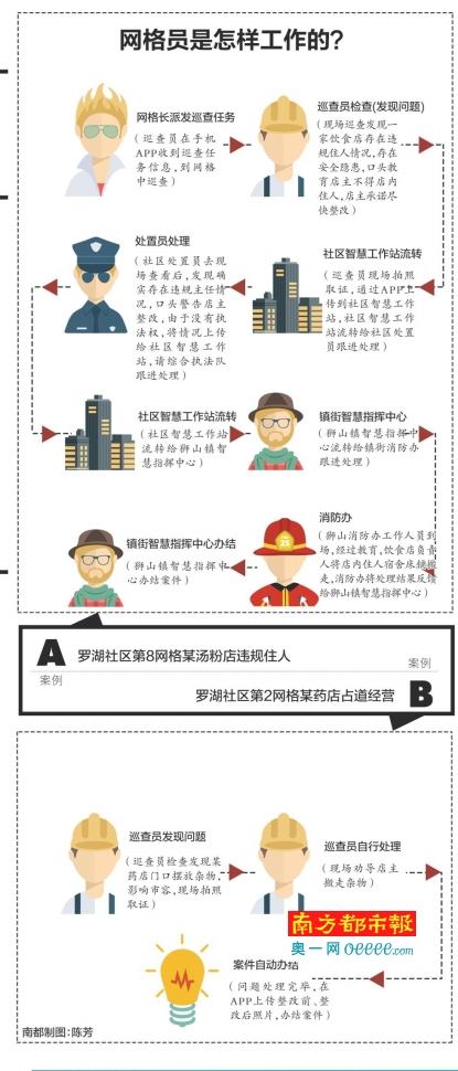 “以前檢查一個(gè)工廠,今天安監(jiān)去,明天消防去,后天城管去,對(duì)企業(yè)干擾多次,現(xiàn)在一個(gè)巡查員去一次就搞掂了。”羅湖社區(qū)黨委副書(shū)記、社區(qū)服務(wù)中心主任吳其國(guó)介紹,實(shí)施網(wǎng)格化之后,該社區(qū)40多名工作人員進(jìn)行重新整合,成為網(wǎng)格里的巡查員、處置員、坐席員,并無(wú)增員。