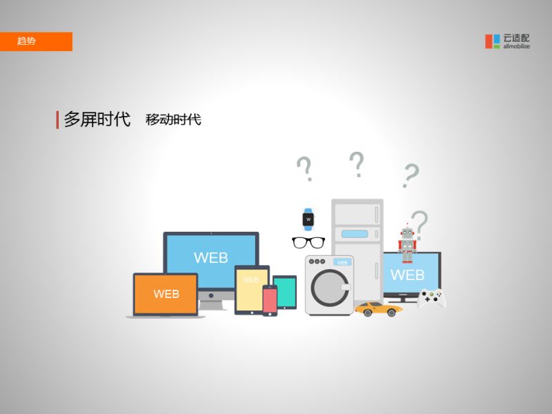 大家現(xiàn)在都叫移動(dòng)互聯(lián)網(wǎng),但是在云適配的眼里,"移動(dòng)互聯(lián)網(wǎng)"的叫法已經(jīng)過(guò)時(shí)了,未來(lái)我們將會(huì)進(jìn)入一個(gè)新的時(shí)代,叫"多屏互聯(lián)網(wǎng)"時(shí)代,因?yàn)槲磥?lái)互聯(lián)網(wǎng)會(huì)接入的設(shè)備不僅僅是手機(jī),還會(huì)有汽車(chē)、手表、眼鏡等等。我們今天已經(jīng)看到有各種各樣的智能設(shè)備接入互聯(lián)網(wǎng),而且人們也正在使用各種各樣的設(shè)備從互聯(lián)網(wǎng)上接收信息。所以政府在做移動(dòng)化、信息化的過(guò)程中,不僅僅是考慮電腦、手機(jī),更重要的是考慮更長(zhǎng)遠(yuǎn)的:各種各樣的屏幕, 未來(lái)可能就是在汽車(chē)上、手表上、眼鏡上接收政府宣傳的信息。