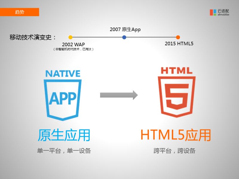 大家可以看到這個(gè)圖上有一個(gè)移動(dòng)技術(shù)的演變史,大家可能都知道在2000年初的時(shí)候有一個(gè)WAP技術(shù),功能機(jī)的時(shí)代就能上網(wǎng),那是一個(gè)非常簡(jiǎn)化版本的移動(dòng)互聯(lián)網(wǎng)標(biāo)準(zhǔn),只能看看非常簡(jiǎn)單的圖片和文字。到了2007年,IPHONE等智能手機(jī)發(fā)布,蘋(píng)果提出了"APP"概念,使得移動(dòng)互聯(lián)網(wǎng)相比WAP的用戶(hù)體驗(yàn)有了顯著的提升。APP也叫原生應(yīng)用,它只是為了一個(gè)單一的平臺(tái)設(shè)計(jì)的,當(dāng)時(shí)蘋(píng)果提出APP的時(shí)候只是為了自己的IOS系統(tǒng),它開(kāi)發(fā)的所有APP也只能在IOS系統(tǒng)上應(yīng)用。后來(lái)GOOGLE也提出了自己安卓系統(tǒng)的APP標(biāo)準(zhǔn)、微軟也提出了自己WINDOWS手機(jī)上的 APP標(biāo)準(zhǔn)??傊?,每個(gè)操作系統(tǒng)的廠(chǎng)商都提出了自己APP的標(biāo)準(zhǔn),這就導(dǎo)致了不同平臺(tái)開(kāi)發(fā)不同的APP這樣的格局。而且當(dāng)時(shí)APP的提出只是為了手機(jī)設(shè)計(jì)的,如果你還要開(kāi)發(fā)IPAD的話(huà),要重新開(kāi)發(fā)。所以簡(jiǎn)單來(lái)說(shuō),APP原生應(yīng)用是為了單一平臺(tái)、單一應(yīng)用而設(shè)計(jì)的。所以后來(lái)W3C也看到這個(gè)問(wèn)題的存在,計(jì)劃推出下一代的HTML5標(biāo)準(zhǔn)技術(shù),HTML5能夠讓你開(kāi)發(fā)的應(yīng)用橫跨所有的平臺(tái)、橫跨所有的設(shè)備。