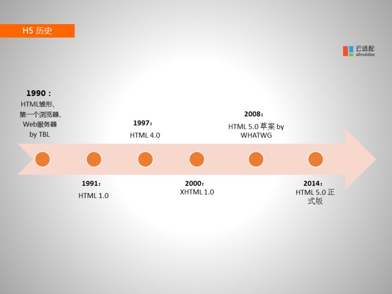 這是一個(gè)HTML發(fā)展的整個(gè)歷史。大家也可以看到世界上第一個(gè)互聯(lián)網(wǎng)雛形是1990年由歐洲一叫TBL的人提出來(lái)的。這個(gè)技術(shù)很快在科研領(lǐng)域得到了認(rèn)可。在1991年,TML把HTML技術(shù)寫(xiě)成了一個(gè)正式的標(biāo)準(zhǔn)文檔,就是當(dāng)時(shí)的HTML1.0。很快,互聯(lián)網(wǎng)技術(shù)迅速?gòu)目蒲蓄I(lǐng)域蔓延到民用領(lǐng)域和商業(yè)領(lǐng)域。尤其在1994年的時(shí)候,網(wǎng)景公司開(kāi)發(fā)了世界上第一個(gè)商用瀏覽器,極大程度促進(jìn)了老百姓對(duì)互聯(lián)網(wǎng)的使用。隨后,微軟馬上也開(kāi)發(fā)了IE瀏覽器。從1994年到1997年,網(wǎng)景瀏覽器和IE瀏覽器之間發(fā)生了激烈的瀏覽器大戰(zhàn),這也極大的促進(jìn)了HTML標(biāo)準(zhǔn)的進(jìn)步。很快,HTML進(jìn)步了幾個(gè)版本,到1997年進(jìn)步到HTML4.0 。當(dāng)然,大家都知道,最后的結(jié)局是IE瀏覽器徹底打敗了網(wǎng)景瀏覽器,搶走了所有瀏覽器的市場(chǎng)份額,所以在IE5.5版本發(fā)布之后,基本IE瀏覽器就是一枝獨(dú)秀了。之后HTML標(biāo)準(zhǔn)就進(jìn)入了很長(zhǎng)一段時(shí)間的平靜期。這個(gè)時(shí)候W3C覺(jué)得當(dāng)時(shí)的HTML設(shè)計(jì)的不夠完善,所以在2000年的時(shí)候提出了XHTML,這個(gè)版本比原版HTML語(yǔ)法要嚴(yán)格很多,也加入了語(yǔ)義的元素進(jìn)去。可惜的是,過(guò)去的HTML4.0已經(jīng)根深蒂固了,很難使得整個(gè)互聯(lián)網(wǎng)向XHTML遷移。最后W3C發(fā)現(xiàn)了XHTML很難推,又恰逢蘋(píng)果發(fā)布了智能手機(jī),整個(gè)市場(chǎng)對(duì)新一代HTML有強(qiáng)烈的需求。在2008年HTML聯(lián)合了另一個(gè)民間組織,發(fā)布了HTML5.0的草案。