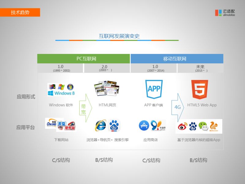 導(dǎo)致從WINDOWS軟件到HTML網(wǎng)頁(yè)的變遷的核心推動(dòng)力就是當(dāng)時(shí)的帶寬。在2000初的時(shí)候,中國(guó)開(kāi)始大規(guī)模的布寬帶,早期撥號(hào)上網(wǎng)的年代網(wǎng)絡(luò)速度很慢,大家都傾向于下載軟件放在桌面上,在沒(méi)有網(wǎng)絡(luò)的時(shí)候也能使用,但是當(dāng)寬帶逐漸普及的時(shí)候,只要打開(kāi)瀏覽器直接輸入網(wǎng)址就能找到想要的信息,沒(méi)有必要下載軟件了。這樣網(wǎng)頁(yè)就取代了軟件。去年中國(guó)的4G牌照下發(fā),三大運(yùn)營(yíng)商都開(kāi)始大規(guī)模的普及4G,這個(gè)4G就有點(diǎn)像當(dāng)年的寬帶,網(wǎng)絡(luò)帶寬大幅度提升,資費(fèi)大幅度降低?,F(xiàn)在李總理也強(qiáng)調(diào)要降低網(wǎng)絡(luò)資費(fèi)。這樣的大的歷史環(huán)境的催生下,APP客戶(hù)端的形式也會(huì)重復(fù)當(dāng)年P(guān)C互聯(lián)網(wǎng)的歷史,向HTML5網(wǎng)頁(yè)形式轉(zhuǎn)變。