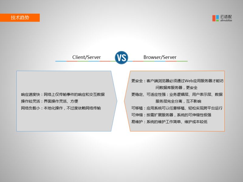 從C/S與B/S的對(duì)比圖可以看出,APP對(duì)比HTML5在響應(yīng)速度、網(wǎng)絡(luò)依賴(lài)的不同。另外我想補(bǔ)充的是,一是B/S結(jié)構(gòu)相對(duì)更加安全。因?yàn)楹诳秃苋菀自L(fǎng)問(wèn)你本地的客戶(hù)端,很多數(shù)據(jù)處理邏輯都在客戶(hù)端里,很容易被黑客竊?。蝗绻荁/S結(jié)構(gòu)的話(huà),你所有的計(jì)算都在服務(wù)器端,別人是很難竊取你的商業(yè)機(jī)密的。第二,客戶(hù)端軟件很容易中病毒的。你發(fā)出去的APP可能被黑客重新打包、接入病毒再傳播出去。比如政務(wù)辦公APP,可能被黑客打包加入病毒再發(fā)布到應(yīng)用商店里去,老百姓在應(yīng)用APP的時(shí)候,所有的行為都可以監(jiān)控到,包括核心支付、個(gè)人信息等,都會(huì)被黑客竊取。因?yàn)锽/S結(jié)構(gòu)的網(wǎng)址是唯一的,黑客是不可能偽造的,比如中國(guó)政府網(wǎng)的網(wǎng)址是www.gov.cn ,老百姓知道這個(gè)網(wǎng)址一定是到達(dá)中國(guó)政府網(wǎng),這就避免了被重新打包的危險(xiǎn)。三是,B/S結(jié)構(gòu)維護(hù)起來(lái)也非常簡(jiǎn)單。很多時(shí)候要升級(jí)服務(wù)器端的產(chǎn)品,但如果用戶(hù)不升級(jí)其APP的話(huà),你還需要保留一份老版本的APP,才能讓其繼續(xù)使用,這個(gè)維護(hù)成本是非常高的,而B(niǎo)/S結(jié)構(gòu)的話(huà),用戶(hù)訪(fǎng)問(wèn)到的永遠(yuǎn)是最新版,不用擔(dān)心兼容性的問(wèn)題。四是操作系統(tǒng)每次升級(jí),APP都要同樣升級(jí),而B(niǎo)/S結(jié)構(gòu)則不會(huì)有這個(gè)問(wèn)題,所以維護(hù)的工作量會(huì)降低很多。