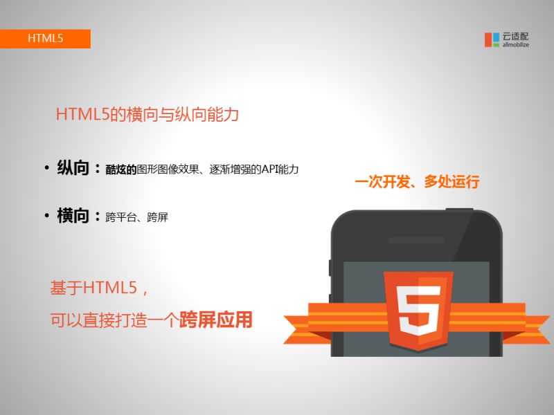 H5它的特性可以歸納成兩個(gè)方向:橫向和縱向。縱向就是有更酷炫的圖像效果,可以做出很豐富的交互界面的應(yīng)用,有很多的增強(qiáng)API可以讓你訪(fǎng)問(wèn)攝像頭、GPS。橫向就是跨平臺(tái)、跨屏,一次開(kāi)發(fā)可以運(yùn)行到很多地方,各種這樣的設(shè)備上。云適配就是致力于幫您打造HTML5跨屏應(yīng)用,對(duì)外讓老百姓無(wú)論使用什么設(shè)備、什么平臺(tái),始終可以通過(guò)同一個(gè)網(wǎng)址訪(fǎng)問(wèn)到您的網(wǎng)站,來(lái)完成政務(wù)辦公系統(tǒng)。對(duì)內(nèi)移動(dòng)辦公協(xié)同系統(tǒng)上,每個(gè)人的手機(jī)、平臺(tái)都不一樣,用HTML5也是非常高效的。