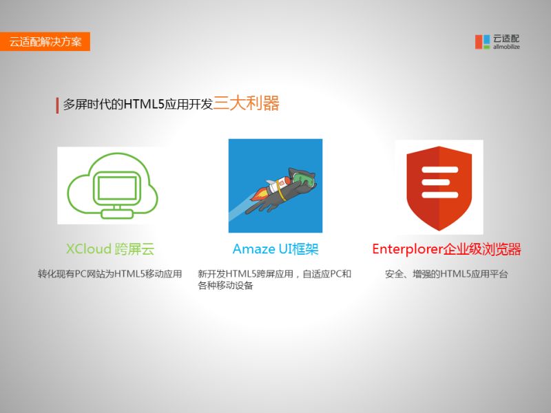 針對(duì)HTML5跨屏應(yīng)用的需求,云適配提供了三大產(chǎn)品線(xiàn)。一是XCLOUD跨屏云,能夠幫把現(xiàn)有的PC網(wǎng)站直接轉(zhuǎn)化成HTML5的移動(dòng)應(yīng)用,直接實(shí)現(xiàn)跨屏。二是 AMAZE UI框架,這個(gè)框架開(kāi)發(fā)出的HTML5應(yīng)用自動(dòng)適應(yīng)PC和各種移動(dòng)設(shè)備。第三個(gè)是瀏覽器,是用來(lái)運(yùn)行HTML5應(yīng)用,它為HTML5提供一個(gè)增強(qiáng)的、安全的運(yùn)行平臺(tái),主要適用于移動(dòng)辦公的環(huán)境。