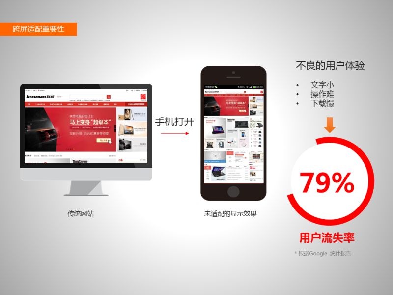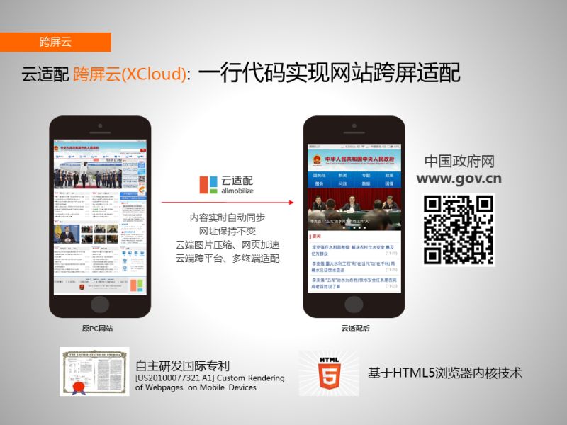 現(xiàn)在的網(wǎng)站一般是由PC開(kāi)發(fā)的,在手機(jī)上打開(kāi)文字和圖片很小,要用雙手去縮放,這個(gè)用戶(hù)體驗(yàn)是非常差的,會(huì)導(dǎo)致79%的用戶(hù)直接離開(kāi)。跨屏云基于自主研發(fā)的國(guó)際專(zhuān)利技術(shù),只要在網(wǎng)站上加一串代碼,就可以把您的PC網(wǎng)站直接轉(zhuǎn)化成HTML5的移動(dòng)應(yīng)用,并且網(wǎng)址不改變、內(nèi)容實(shí)時(shí)更新。大家可以在手機(jī)上打開(kāi)www.gov.cn 體驗(yàn)一下中國(guó)政府網(wǎng)使用云適配的效果。網(wǎng)址不改變是非常重要的,老百姓可以按照原來(lái)在PC上使用政務(wù)系統(tǒng)的方式在手機(jī)上直接訪(fǎng)問(wèn)政務(wù)系統(tǒng)。