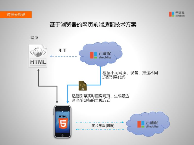 從跨屏云的工作原理可以看出,它是一個(gè)純前端的解決方案,不涉及后臺(tái)的東西,只要在網(wǎng)站前端加一串代碼,不需要原來(lái)PC網(wǎng)站的代碼和數(shù)據(jù)庫(kù),這是非常安全的。用戶(hù)在用手機(jī)訪(fǎng)問(wèn)原來(lái)網(wǎng)站的時(shí)候,因?yàn)榫W(wǎng)頁(yè)里加了云適配的代碼,手機(jī)瀏覽器就會(huì)加載這個(gè)代碼,從云端下載一個(gè)適配引擎,適配引擎會(huì)對(duì)當(dāng)前的網(wǎng)頁(yè)做出重新的排版,轉(zhuǎn)化成HTML5移動(dòng)應(yīng)用的效果。同時(shí)我們還提供圖片壓縮功能,可以大幅度增加下載速度。根據(jù)統(tǒng)計(jì)可以把圖片壓縮到原來(lái)的20%,也就是流量可以節(jié)省到原來(lái)的1/5,這也是非常有效果的。