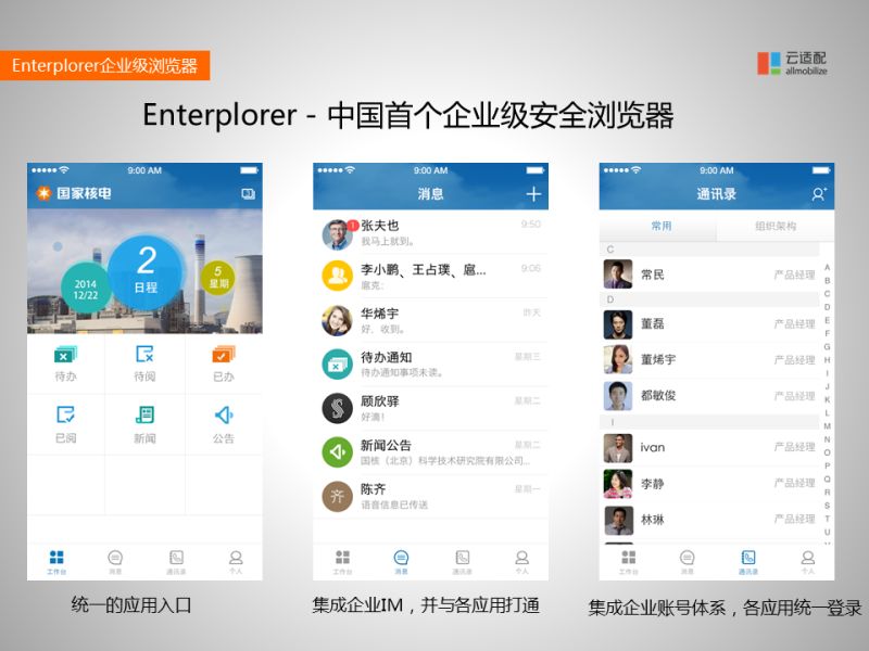 針對(duì)這種情況,我們開(kāi)發(fā)了中國(guó)第一個(gè)企業(yè)級(jí)安全瀏覽器,能把辦公系統(tǒng)整合到一起,并移動(dòng)化,既方便員工又方便企業(yè)管理。同時(shí)還集成了企業(yè)的IM,能夠讓各個(gè)辦公系統(tǒng)的應(yīng)用向員工發(fā)通知。比如一個(gè)流程做完了,通過(guò)即時(shí)通訊工具直接通知下一個(gè)流程辦理人員,還集成了企業(yè)員工的賬號(hào)體系,實(shí)現(xiàn)統(tǒng)一的登陸,應(yīng)用系統(tǒng)就暢通無(wú)阻。