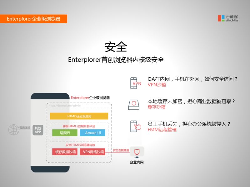 最重要的還是安全,目前市面上的瀏覽器都是給消費(fèi)者用的,在安全上并沒(méi)有下很深的功夫。很多企業(yè)的OA系統(tǒng)都是在內(nèi)網(wǎng)中的,外網(wǎng)是無(wú)法訪(fǎng)問(wèn)的。這個(gè)在PC時(shí)代是沒(méi)有問(wèn)題的,但是在移動(dòng)時(shí)代,領(lǐng)導(dǎo)經(jīng)常要出差,需要訪(fǎng)問(wèn)內(nèi)網(wǎng)辦公系統(tǒng)。如何能夠安全的訪(fǎng)問(wèn)到內(nèi)網(wǎng)系統(tǒng)面臨很大的挑戰(zhàn)。我們的瀏覽器內(nèi)核自帶VPN,通過(guò)瀏覽器直接撥到內(nèi)網(wǎng),OA還是在內(nèi)網(wǎng)上,很安全的。